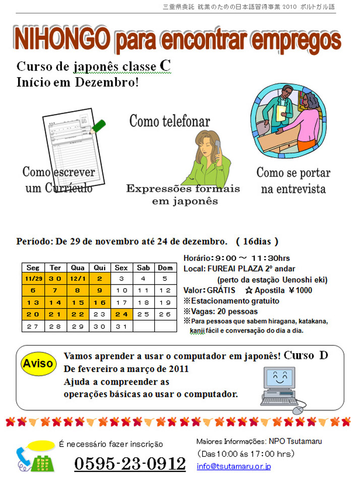 Curso de japonês da NPO Tsutamaru (Nihongo para encontrar emprego) (三重県委託) NPO伊賀の伝丸による「就業のための日本語習得事業 2010」の開催案内 Share! Share on Facebook(abre em nova janela) Facebook Email a link to a friend(abre em nova janela) E-mail Share on X(abre em nova janela) 18+ Share on WhatsApp(abre em nova janela) WhatsApp 2010/11/04 quinta-feira Seminários e Eventos A NPO Tsutamaru abre inscrições para o curso de japonês para aqueles que procuram emprego. Horário: das 9:00 às 11:30 Local: FUREAI PLAZA 2º andar(perto da estação Uenoshi eki) Período: De 29 de novembro até 24 de dezembro. (16dias) Valor:GRÁTIS ☆ Apostila ¥1000 Veja mais detalhes no panfleto abaixo. Share! Share on Facebook(abre em nova janela) Facebook Email a link to a friend(abre em nova janela) E-mail Share on X(abre em nova janela) 18+ Share on WhatsApp(abre em nova janela) WhatsApp « Curso “Vamos aprender a usar o computador em japonês!” Seminário sobre nutrição e Saúde no Japão » ↑↑ Próxima Informação ↑↑ Curso “Vamos aprender a usar o computador em japonês!” 2010/11/04 quinta-feira Seminários e Eventos NPO伊賀の伝丸による「日本語でパソコンを使おう!」講座の開講案内 Share! Share on Facebook(abre em nova janela) Facebook Email a link to a friend(abre em nova janela) E-mail Share on X(abre em nova janela) 18+ Share on WhatsApp(abre em nova janela) WhatsApp A NPO Tsutamaru abre inscrições para o curso de computação em japonês, conforme segue abaixo. Público alvo: Para pessoas que conseguem ler e escrever o Hiragana e Katakana sem dificuldade e que consigam escrever mais ou menos 30 kanjis. Para pessoas que sabem conversação do dia a dia . Ajuda a compreender as operações básicas para usar o computador. Dias:10.13.16.17.20.21.24.27 de Dezembro; em janeiro também terá 8 aulas.(16 dias) Local:Tsu Chiiki Joho Center Valor do curso: GRÁTIS Valor da apostila: ¥1,000 Horário das 13:30 às 16:30 horas (3hs de curso) Os 15 primeiros inscritos Mais informações no panfleto abaixo. Share! Share on Facebook(abre em nova janela) Facebook Email a link to a friend(abre em nova janela) E-mail Share on X(abre em nova janela) 18+ Share on WhatsApp(abre em nova janela) WhatsApp