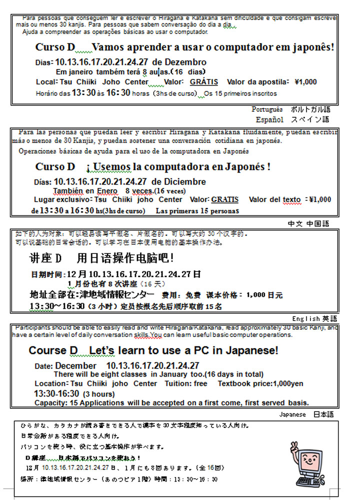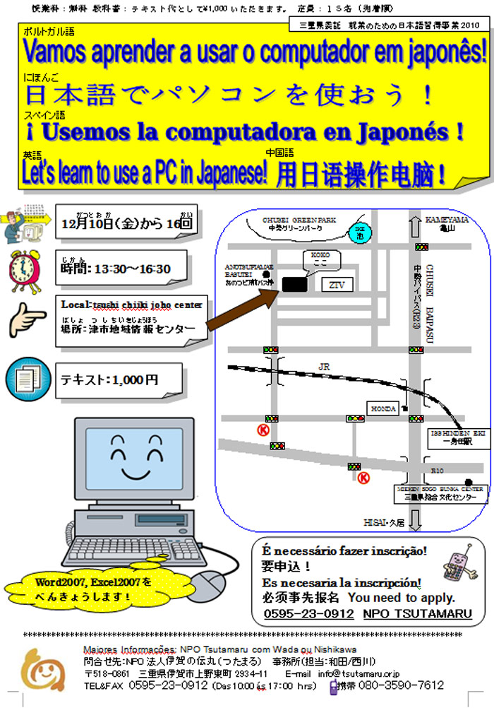 Curso “Vamos aprender a usar o computador em japonês!” NPO伊賀の伝丸による「日本語でパソコンを使おう!」講座の開講案内 Share! Clique para compartilhar no Facebook(abre em nova janela) Facebook Clique para enviar um link por e-mail para um amigo(abre em nova janela) E-mail Clique para compartilhar no X(abre em nova janela) 18+ Clique para compartilhar no WhatsApp(abre em nova janela) WhatsApp 2010/11/04 quinta-feira Seminários e Eventos A NPO Tsutamaru abre inscrições para o curso de computação em japonês, conforme segue abaixo. Público alvo: Para pessoas que conseguem ler e escrever o Hiragana e Katakana sem dificuldade e que consigam escrever mais ou menos 30 kanjis. Para pessoas que sabem conversação do dia a dia . Ajuda a compreender as operações básicas para usar o computador. Dias:10.13.16.17.20.21.24.27 de Dezembro; em janeiro também terá 8 aulas.(16 dias) Local:Tsu Chiiki Joho Center Valor do curso: GRÁTIS Valor da apostila: ¥1,000 Horário das 13:30 às 16:30 horas (3hs de curso) Os 15 primeiros inscritos Mais informações no panfleto abaixo. Share! Clique para compartilhar no Facebook(abre em nova janela) Facebook Clique para enviar um link por e-mail para um amigo(abre em nova janela) E-mail Clique para compartilhar no X(abre em nova janela) 18+ Clique para compartilhar no WhatsApp(abre em nova janela) WhatsApp « Seminário sobre saúde em Iga Curso de japonês da NPO Tsutamaru (Nihongo para encontrar emprego) » ↑↑ Próxima Informação ↑↑ Seminário sobre saúde em Iga 2010/11/04 quinta-feira Seminários e Eventos 平成22年12月5日に開催される健康セミナーの開催案内(NPO伊賀の伝丸実施 ・ 外国人住民アドバイザー事業) Share! Clique para compartilhar no Facebook(abre em nova janela) Facebook Clique para enviar um link por e-mail para um amigo(abre em nova janela) E-mail Clique para compartilhar no X(abre em nova janela) 18+ Clique para compartilhar no WhatsApp(abre em nova janela) WhatsApp A NPO Tsutamaru irá realizar um seminário sobre saúde em Iga. Data: 05/dez (dom), das 10:00 às 11:30 Local: Fureal Plaza, quarto andar, Iga Veja mais detalhes no panfleto abaixo. Share! Clique para compartilhar no Facebook(abre em nova janela) Facebook Clique para enviar um link por e-mail para um amigo(abre em nova janela) E-mail Clique para compartilhar no X(abre em nova janela) 18+ Clique para compartilhar no WhatsApp(abre em nova janela) WhatsApp