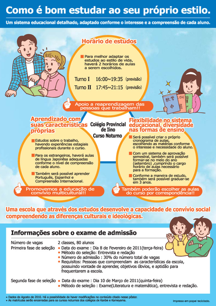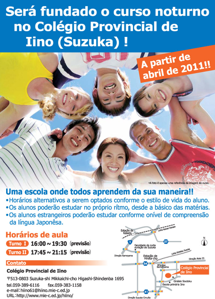 Kodomo Yokkaichi 2010 「こども四日市2010」の開催案内(平成22年11月6日(土)~7日(日) Share! Clique para compartilhar no Facebook(abre em nova janela) Facebook Clique para enviar um link por e-mail para um amigo(abre em nova janela) E-mail Clique para compartilhar no X(abre em nova janela) 18+ Clique para compartilhar no WhatsApp(abre em nova janela) WhatsApp 2010/10/27 quarta-feira Cultura e Lazer, Seminários e Eventos Data e horário: 6 e 7 de novembro de 2010 (sábado e domingo) 10:00 às 16:00 (realizaremos mesmo sob chuva) Local: Parque Suwa, Yokkaichi (próximo à estação Kintetsu Yokkaichi ) ★Participação livre (taxa de 200 ienes)★ Haverá intérpretes no local. Veja mais detalhes no panfleto abaixo. Share! Clique para compartilhar no Facebook(abre em nova janela) Facebook Clique para enviar um link por e-mail para um amigo(abre em nova janela) E-mail Clique para compartilhar no X(abre em nova janela) 18+ Clique para compartilhar no WhatsApp(abre em nova janela) WhatsApp « Abertura de curso noturno na escola de ensino médio Iino Koukou em Suzuka Seminário sobre Segurança no Trânsito » ↑↑ Próxima Informação ↑↑ Abertura de curso noturno na escola de ensino médio Iino Koukou em Suzuka 2010/10/27 quarta-feira Cultura e Lazer, Seminários e Eventos 県立飯野高等学校(鈴鹿市)に定時制課程が誕生します!2011年4月スタート! Share! Clique para compartilhar no Facebook(abre em nova janela) Facebook Clique para enviar um link por e-mail para um amigo(abre em nova janela) E-mail Clique para compartilhar no X(abre em nova janela) 18+ Clique para compartilhar no WhatsApp(abre em nova janela) WhatsApp A escola de ensino médio Iino Koukou de Suzuka irá abrir curso noturno a partir de abril de 2011. Esta é uma iniciativa para atender melhor os estudantes que poderão estudar de acordo com o seu ritmo e os alunos estrangeiros poderão estudar de acordo com o seu nível de compreensão da língua japonesa. Veja panfleto abaixo para maiores informações. Share! Clique para compartilhar no Facebook(abre em nova janela) Facebook Clique para enviar um link por e-mail para um amigo(abre em nova janela) E-mail Clique para compartilhar no X(abre em nova janela) 18+ Clique para compartilhar no WhatsApp(abre em nova janela) WhatsApp
