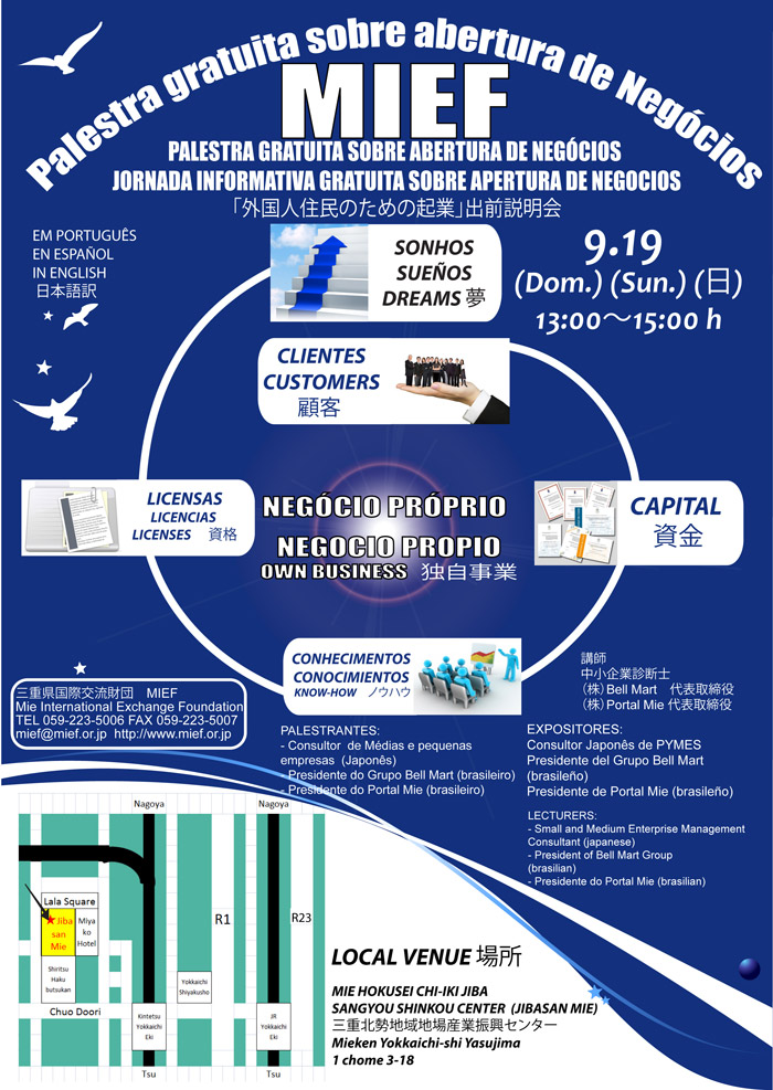 Palestra Gratuita sobre abertura de Negócios 9月19日にMIEFが開催する「外国人住民のための起業」出前説明会の開催案内 Share! Share on Facebook(abre em nova janela) Facebook Email a link to a friend(abre em nova janela) E-mail Share on X(abre em nova janela) 18+ Share on WhatsApp(abre em nova janela) WhatsApp 2010/09/14 terça-feira Seminários e Eventos Seminário da Fundação de Intercâmbio Internacional de Mie especialmente sobre a abertura de negócios no Japão. Montar um negócio desde o início, as licenças e documentação necessária até a abertura e aquisição de clientes. Uma excelente oportunidade para conhecer melhor o sistema japonês relativo a empresas e ter contato com empresários que estão trabalhando e tendo sucesso aqui no Japão. Palestra gratuita. Compareça! Palestrantes: Consultor PME japonês Bell Mart Presidente do Grupo (Brasil) Presidente do Portal Mie (Brasil) Share! Share on Facebook(abre em nova janela) Facebook Email a link to a friend(abre em nova janela) E-mail Share on X(abre em nova janela) 18+ Share on WhatsApp(abre em nova janela) WhatsApp « Seminário sobre terremotos Campanha de Outono de Segurança no Trânsito » ↑↑ Próxima Informação ↑↑ Seminário sobre terremotos 2010/09/14 terça-feira Seminários e Eventos 10月3日にNPO伊賀の伝丸が開催する「在住外国人のための防災セミナー」の開催案内 Share! Share on Facebook(abre em nova janela) Facebook Email a link to a friend(abre em nova janela) E-mail Share on X(abre em nova janela) 18+ Share on WhatsApp(abre em nova janela) WhatsApp Seminário sobre terremotos no Fureai Plaza 4° andar, cidade de Iga em Mie promovido pela NPO Tsutamaru. Seminário com dicas importantes de prevenção e sobrevivência no caso de desastres naturais! No dia haverá degustação de alimentos usados em emergências. Compareça porque é muito importante! Share! Share on Facebook(abre em nova janela) Facebook Email a link to a friend(abre em nova janela) E-mail Share on X(abre em nova janela) 18+ Share on WhatsApp(abre em nova janela) WhatsApp