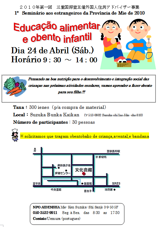Seminário sobre educação alimentar e obentô infantil 4月24日(土) NPO愛伝舎による日本のお弁当の作り方についてのセミナー開催案内 Share! Compartilhar no Facebook(abre em nova janela) Facebook Envie um link por e-mail para um amigo(abre em nova janela) E-mail Compartilhar no X(abre em nova janela) 18+ Compartilhar no WhatsApp(abre em nova janela) WhatsApp 2010/04/16 sexta-feira Seminários e Eventos Pensando na boa nutrição para o desenvolvimento e integração social das crianças nas próximas atividades escolares, vamos aprender a fazer obento para seu filho!! Dia 24 de Abril (Sáb.) Horário 9:30 ~ 14:00 Taxa:300 ienes(p/a compra de material) Local:Suzuka Bunka Kaikan (〒513-0802 Suzuka-shi Ino Jike -cho 810) Número de participantes : 30 pessoas ※solicitamos que tragam obentobako de criança,avental,e bandana Share! Compartilhar no Facebook(abre em nova janela) Facebook Envie um link por e-mail para um amigo(abre em nova janela) E-mail Compartilhar no X(abre em nova janela) 18+ Compartilhar no WhatsApp(abre em nova janela) WhatsApp « Biblioteca de Mie oferece livros em português e espanhol Aprendendo a fazer Obento – dicas de nutrição »