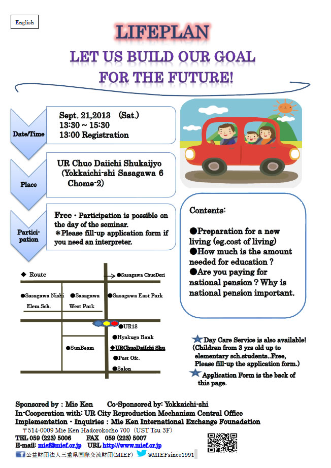 [Seminar] For developing relationship between people and spend a happy life, let us learn japanese 9月29日に亀山市で、日本語学習の大切さについてのセミナーが開催されます Share! Click to share on Facebook (Opens in new window) Facebook Click to email a link to a friend (Opens in new window) Email Click to share on X (Opens in new window) X Click to share on WhatsApp (Opens in new window) WhatsApp 2013/09/09 Monday Seminars and Events Contents: Importance of learning Japanese Check participants’ ability of Japanese How to write resume properly ・Preparation for an interview Date: Sept.29,2013 (Sun) Time: 14:00~17:00 13:30~Registration Place:Kameyama Seishonen Kenshu Center ,2F Kenshushitu 2 (Kameyama-shi Wakayama Cho 7-10) Participation:Free ・Everybody can participate on the day of the seminar. For those who need an interpreter, please make a reservation. Interpreters available in: Portuguese, Spanish, Tagalog, English, Chinese, Vietnamese, Indonesian and Thai There’s a ‘Worlds Game for Children’ Fun Corner! Japan, Brazil、 Philippines and Peru’s game will be introduced and demonstrated. Participation is free、please make your reservation. (Application is at the back of this page) Implementation・Inquiries:Mie Ken International Exchange Foundation(MIEF) TEL 059 (223) 5006 FAX 059 (223) 5007 Download of PDF file: For developing relationship between people and spend a happy life, let us learn japanese Share! Click to share on Facebook (Opens in new window) Facebook Click to email a link to a friend (Opens in new window) Email Click to share on X (Opens in new window) X Click to share on WhatsApp (Opens in new window) WhatsApp « [Seminar] Let us build our goal for the Future Mie Prefectural Art Gallery ‘Special Feature Exhibition: Spanish Modern Art’ » ↑↑ Next Information ↑↑ [Seminar] Let us build our goal for the Future 2013/09/09 Monday Seminars and Events 9月21日(土)に四日市市で「ライフプラン」のセミナーを開催します Share! Click to share on Facebook (Opens in new window) Facebook Click to email a link to a friend (Opens in new window) Email Click to share on X (Opens in new window) X Click to share on WhatsApp (Opens in new window) WhatsApp Contents: ●Preparation for a new living (eg.cost of living) ●How much is the amount needed for education ? ●Are you paying for national pension?Why is national pension important. Day Care Service is also available! (Children from 3 yrs old up to elementary sch.students. Free, Please fill-up the application form.) Date/Time: Sept. 21,2013 (Sat.) 13:30 ~ 15:30 13:00 Registration Place: UR Chuo Daiichi Shukaijyo (Yokkaichi-shi Sasagawa 6 Chome-2) Participation: Free・Participation is possible on the day of the seminar. *Please fill-up application form if you need an interpreter. Sponsored by:Mie Ken Co-Sponsored by: Yokkaichi-shi In-Cooperation with: UR City Reproduction Mechanism Central Office Implementation・Inquiries:Mie Ken International Exchange Founadation 〒514-0009 Mie Ken Hadorokocho 700(UST Tsu 3F) TEL 059 (223) 5006 FAX 059 (223) 5007 E-mail: mief@mief.or.jp URL http://www.mief.or.jp PDF Download: [PDF] Let us build our goal for the Future Share! Click to share on Facebook (Opens in new window) Facebook Click to email a link to a friend (Opens in new window) Email Click to share on X (Opens in new window) X Click to share on WhatsApp (Opens in new window) WhatsApp