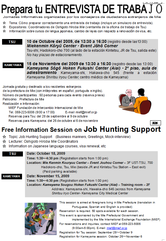 18/10 Seminario explicativo – Cómo tener éxito en las entrevistas MIEFが10月18日に開催する「就職のためのマナー」説明会の開催案内 Share! Share on Facebook (Opens in new window) Facebook Email a link to a friend (Opens in new window) Email Share on X (Opens in new window) X Share on WhatsApp (Opens in new window) WhatsApp 2009/09/16 Wednesday Seminarios y Eventos Para aquellos que quieren tener éxito en ENTREVISTAS ☆ Tema de la conferencia: comportamiento durante el proceso de selección (la conducta profesional, saludos, etc.) simulación de Entrevista de trabajo Panelistas: Coordinadores de Oshigoto Hiroba Mie ☆ Habrá también un informe sobre cursos de Japones y la renovación de visados, etc Fecha: 18 de octubre de 2009 Hora: 13:30 a 16:30 h. (recepción desde las 13:00 h) Local: Mié Kenmin Kouryuu Centro – Evento Jouhou Corner – UST-Tsu Construcción – 3er. piso Dirección.: Tsu-Shi-cho Hadokoro 700 (junto a la estación de JR Tsu, Kintetsu-salida este) Hay un aparcamiento gratuito en el sitio. Fecha: 15 de noviembre de 2009 Hora: 13:30 a 16:30 h. (recepción desde las 13:00 h) Ubicación: Kameyama Sogo Hoken Fukushi Center (Suspiro) – Sala de Entrenamiento 2do. piso Fin: Kameyama-shi, Hawak-cho 545 (en frente de Kameyama Shiritsu Iryou Center-Centro Médico de la ciudad de Kameyama) Audiencia: Los extranjeros residentes en la prefectura de Mie (traducción: Portugués, Español e Inglés) Número de participantes: 50 para cada local (la reserva es necesaria) Patrocinado por la provincia de Mie Director: Mief (Fundación para el Intercambio Internacional de Mie) Reservas e información: Mief-Tel. 059-223-5006 (9:00 ~ 17:00) Plazo para reservas: Tsu: 28/set. 9/out ~. Kameyama: 26/out. ~ 11/Nov. E-mail: mief@mief.or.jp Share! Share on Facebook (Opens in new window) Facebook Email a link to a friend (Opens in new window) Email Share on X (Opens in new window) X Share on WhatsApp (Opens in new window) WhatsApp « 04/10 Seminario sobre terremotos en Iga Empleo – Interesados sobre educación »