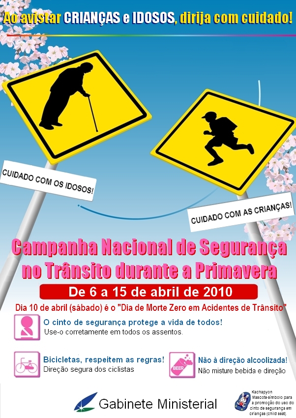 Campanha Nacional de Segurança no Trânsito durante a Primavera 春の交通安全キャンペーンについて Share! Share on Facebook (Opens in new window) Facebook Email a link to a friend (Opens in new window) Email Share on X (Opens in new window) X Share on WhatsApp (Opens in new window) WhatsApp 2010/03/24 Wednesday Noticias @es, Seguridad 10 de abril, es el “Día de Cero Muertes en Accidentes de Tráfico.” El Gobierno japonés inició una campaña nacional para la seguridad del tráfico. Los folletos a continuación tiene la información y consejos importantes para los ciudadanos. Observar las normas de seguridad es muy importante. Share! Share on Facebook (Opens in new window) Facebook Email a link to a friend (Opens in new window) Email Share on X (Opens in new window) X Share on WhatsApp (Opens in new window) WhatsApp « Curso básico de japonés – Módulo 7 Lanzamiento de Guía de Carreras para alumnos extranjeros (orientación profesional en varias lenguas) »