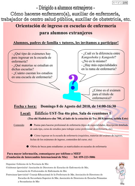 (2010年7月)Orientaciones sobre Ingreso en Escuelas de Enfermeria 8月8日 MIEFによる看護学校進学についての説明会開催案内 Share! Share on Facebook (Opens in new window) Facebook Email a link to a friend (Opens in new window) Email Share on X (Opens in new window) X Share on WhatsApp (Opens in new window) WhatsApp 2010/06/03 Thursday Carrera, Educacion, Noticias @es, Seminarios y Eventos La Fundación para el Intercambio Internacional de Mie realizará una sesión de orientación para estudiantes extranjeros sobre el ingreso a las escuelas de enfermería. Se explicará las formas de entrada (la prueba, las formas de estudio, etc), información sobre la profesión de enfermería y otras disciplinas relacionadas. Para usted que busca nuevas perspectivas para el futuro, esto puede ser una gran oportunidad. Existen sistemas, de becas y otras ayudas de estudio disponibles, que también se explicará en el día. Fecha: 08 de agosto 2010 (Domingo) 14:00-16:30 Localización: Tsu-UST cuarto piso de la Sala N º 1 (Hadokoro-cho 700 Tsu-shi, la estación de Tsu siguiente de JR / Kintetsu, salida este) Contenido ● Para convertirse en un profesional de enfermería (tipos de profesionales, descripción de las actividades de cada profesión, el proceso para convertirse en un profesional de enfermería, etc) ● Para inscribirse en las escuelas de enfermería (habilidades, los materiales que entran en la prueba, la prueba de selección de la programación, el contenido de los estudios de comprobación, etc) ● Presentación de becas para estudiantes orientados a estudiar en las escuelas de enfermería Suscripciones: Rellene el siguiente formulario y enviar o tomar personalmente a MIEF (Fundación de Intercambio Internacional de Mie) hasta el día 28/julho (miércoles). Más informaciones sobre la inscripción en el mismo formulario que está disponible para su descarga a continuación. Formulario de inscripción (descargar aquí) Información: MIEF (Fundación de Intercambio Internacional de Mie) Tel: 059-223-5006 Share! Share on Facebook (Opens in new window) Facebook Email a link to a friend (Opens in new window) Email Share on X (Opens in new window) X Share on WhatsApp (Opens in new window) WhatsApp « Concurso de Fotografias sobre Derechos Humanos Seminario sobre “Negocios Fraudulentos” »