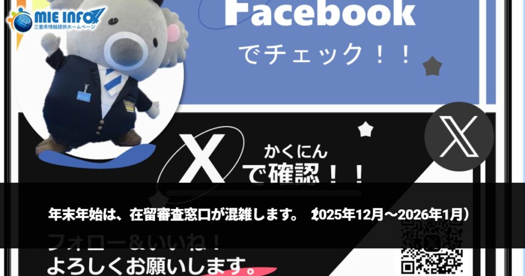 Aviso de congestionamento da Imigração (dezembro de 2025 a janeiro de 2026) 年末年始は、在留審査窓口が混雑します。(2025年12月~2026年1月) Share! Clique para compartilhar no Facebook(abre em nova janela) Facebook Clique para enviar um link por e-mail para um amigo(abre em nova janela) E-mail Clique para compartilhar no X(abre em nova janela) 18+ Clique para compartilhar no WhatsApp(abre em nova janela) WhatsApp 2025/12/22 segunda-feira Comunicados Todos os anos, durante o período de Ano-Novo, muitas pessoas estrangeiras vão ao Departamento de Imigração da Agência de Serviços de Imigração (Shutsunyu-koku Zairyu Kanri-kyoku出入国在留管理局) para fazer diversos pedidos relacionados à permanência no Japão, e por isso os balcões de análise de residência ficam muito congestionados. De 27 de dezembro de 2025 a 4 de janeiro de 2026, não será possível fazer procedimentos, pois é o recesso de fim de ano e Ano-Novo. Por esse motivo, é esperado que haja congestionamento especialmente nos dias 26 de dezembro de 2025 e 4 de janeiro de 2026, por serem datas próximas ao feriado. Quem for à Imigração nesse período, utilize transporte público sempre que possível. Se a sua situação de visto/status de residência e o prazo de permanência permitirem, recomendamos evitar o período de fim de ano e Ano-Novo: assim você consegue fazer o procedimento com menos tempo de espera. As informações sobre a lotação são divulgadas nas redes sociais do Departamento de Imigração de Nagoya. Aproveite para acompanhar. O panfleto está aqui. Endereços Departamento de Imigração de Nagoya: Aichi-ke, Nagoya-shi Minato-ku Shōhō-chō 5-18 Posto do Porto de Yokkaichi: Mie-ken Yokkaichi-shi Chitose-cho 5-1 Prédio conjunto do Porto de Yokkaichi (1º andar) Share! Clique para compartilhar no Facebook(abre em nova janela) Facebook Clique para enviar um link por e-mail para um amigo(abre em nova janela) E-mail Clique para compartilhar no X(abre em nova janela) 18+ Clique para compartilhar no WhatsApp(abre em nova janela) WhatsApp « Proteja-se de desastres : como fazer preparativos no dia a dia ↑↑ Próxima Informação ↑↑ Proteja-se de desastres : como fazer preparativos no dia a dia 2025/12/22 segunda-feira Comunicados 災害に備えて、日頃から準備をしましょう Share! Clique para compartilhar no Facebook(abre em nova janela) Facebook Clique para enviar um link por e-mail para um amigo(abre em nova janela) E-mail Clique para compartilhar no X(abre em nova janela) 18+ Clique para compartilhar no WhatsApp(abre em nova janela) WhatsApp Mie Bosai Navi No aplicativo oficial de prevenção a desastres da província, “Mie Bosai Navi”, você pode ver no mapa a localização dos abrigos de evacuação próximos. Também é possível conferir informações sobre desastres divulgadas pela Província de Mie. Desta vez, 3 novas funções foram adicionadas ao app (09 de dezembro de 2025). Função de navegação por voz até abrigos/pontos de evacuação Você pode usar o Google Maps com orientação por voz até o abrigo mais próximo. Função para visualizar imagens de câmeras de monitoramento de estradas Você pode ver imagens de câmeras em 163 pontos dentro da Província de Mie. Botão para ligar para o “Disque Recados para Desastres 171” O Disque Recados para Desastres 171 é uma “caixa postal de voz” que pode ser usada quando, após um desastre, as comunicações para a área afetada aumentam e fica difícil completar ligações. Foi adicionado um botão para fazer a chamada ao 171. Para mais detalhes e para baixar o “Mie Bosai Navi”, veja aqui (artigo do MieInfo). Bosaimie.jp No bosaimie.jp, você pode ver informações sobre desastres como chuvas fortes, tufões, terremotos e tsunamis. (Acesse: https://www.bosaimie.jp/) Centro Multilíngue de Apoio em Desastres da Província de Mie Quando ocorrer um grande terremoto ou tsunami, eles traduzem e divulgam informações necessárias. Você também pode consultar e pedir ajuda se tiver problemas durante um desastre. (Site: http://mief.or.jp/wp/tagengo/) Desastres podem acontecer a qualquer momento. Para proteger vidas e o cotidiano, vamos nos preparar desde já. Share! Clique para compartilhar no Facebook(abre em nova janela) Facebook Clique para enviar um link por e-mail para um amigo(abre em nova janela) E-mail Clique para compartilhar no X(abre em nova janela) 18+ Clique para compartilhar no WhatsApp(abre em nova janela) WhatsApp