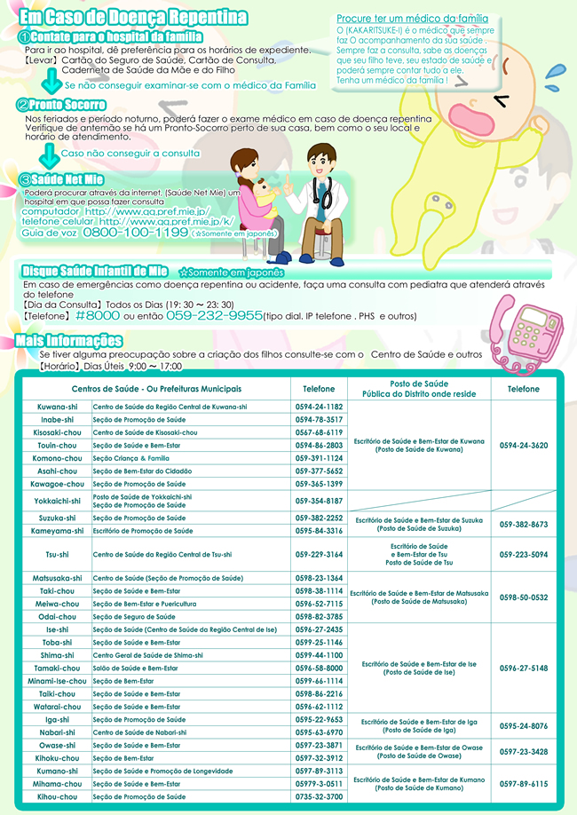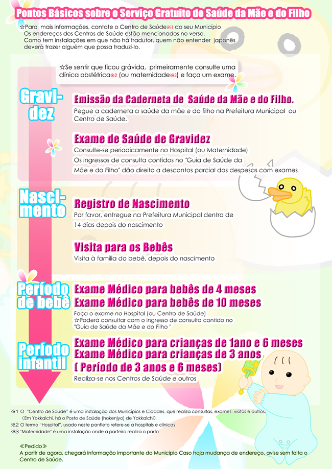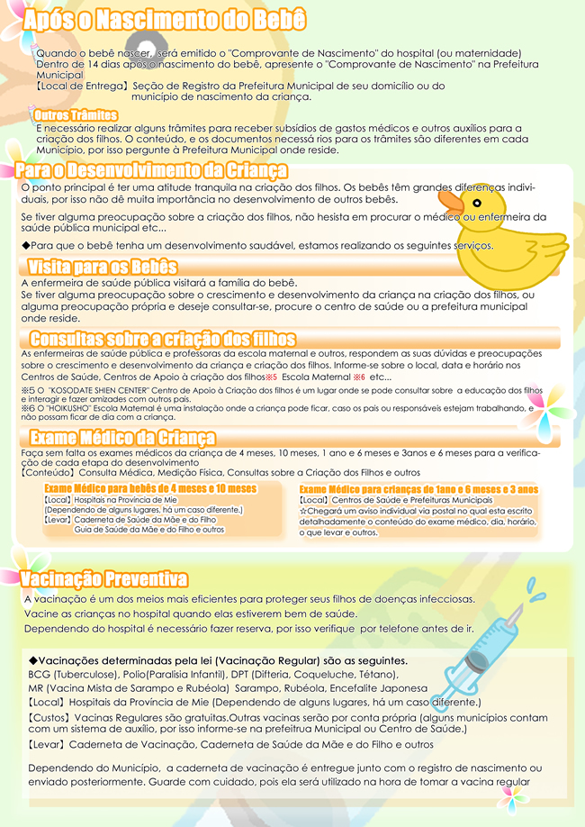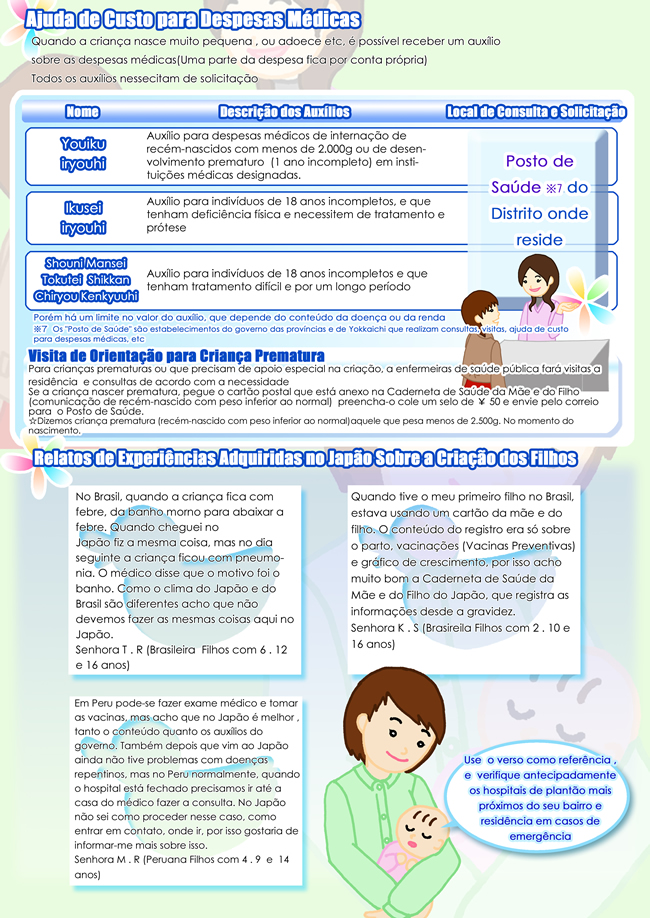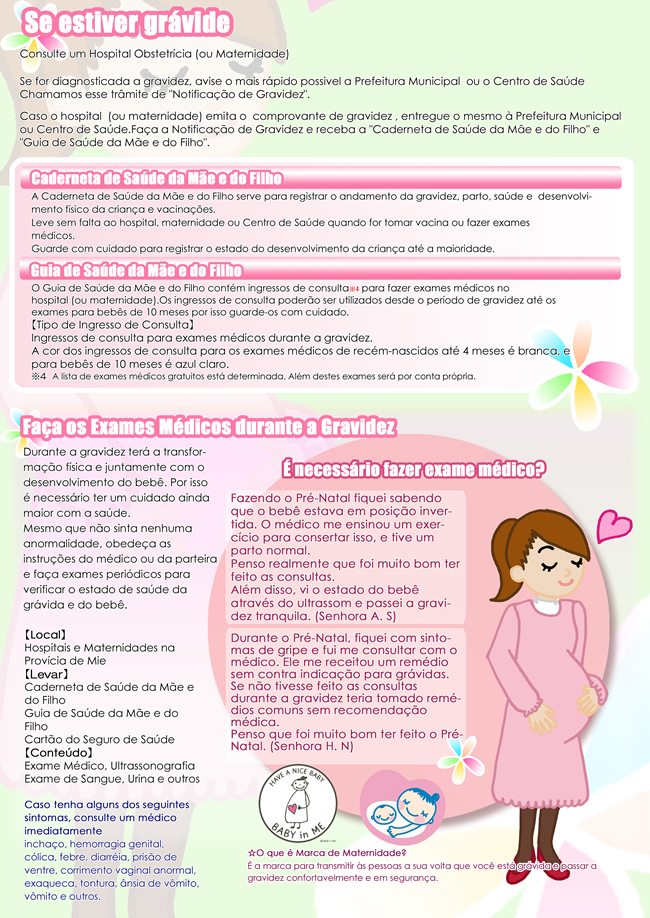 Guia prático para Futuras Mães ママになるみなさまへ~母子保健サービスのご案内~三重県健康福祉部こども局発行 日本でこれからお母さんになる外国人の方々を対象とした情報冊子。無料サービスや妊娠・育児に関するその他の情報を提供します。 Share! Compartilhar no Facebook(abre em nova janela) Facebook Envie um link por e-mail para um amigo(abre em nova janela) E-mail Compartilhar no X(abre em nova janela) 18+ Compartilhar no WhatsApp(abre em nova janela) WhatsApp 2010/07/23 sexta-feira Panfletos Informativos, Saúde e Bem-Estar Informações sobre o Serviço Gratuito de Saúde da Mãe e do Filho A Agência de Saúde e Bem-estar da Criança da província de Mie lançou um guia prático para futuras mães estrangeiras que traz informações sobre os procedimentos a serem realizados quando uma gravidez for confirmada, exames de pré-natal, sistemas existentes para auxiliar a gravidez saudável e um parto seguro e outras informações úteis. Muitas são as preocupações de mulheres que ficam grávidas no Japão, principalmente se for a primeira gravidez e se a pessoa não domina a língua e não conhece o sistema de saúde japonês. Você que está grávida ou está planejando uma gravidez no Japão, este guia pode ser muito útil para tirar dúvidas frequentes e ficar sabendo de informações importantes e essenciais para uma gravidez saudável e um parto tranquilo. Leia abaixo. Share! Compartilhar no Facebook(abre em nova janela) Facebook Envie um link por e-mail para um amigo(abre em nova janela) E-mail Compartilhar no X(abre em nova janela) 18+ Compartilhar no WhatsApp(abre em nova janela) WhatsApp « Inscrições para aulas esportivas orientadas por atletas renomados Censo Nacional »