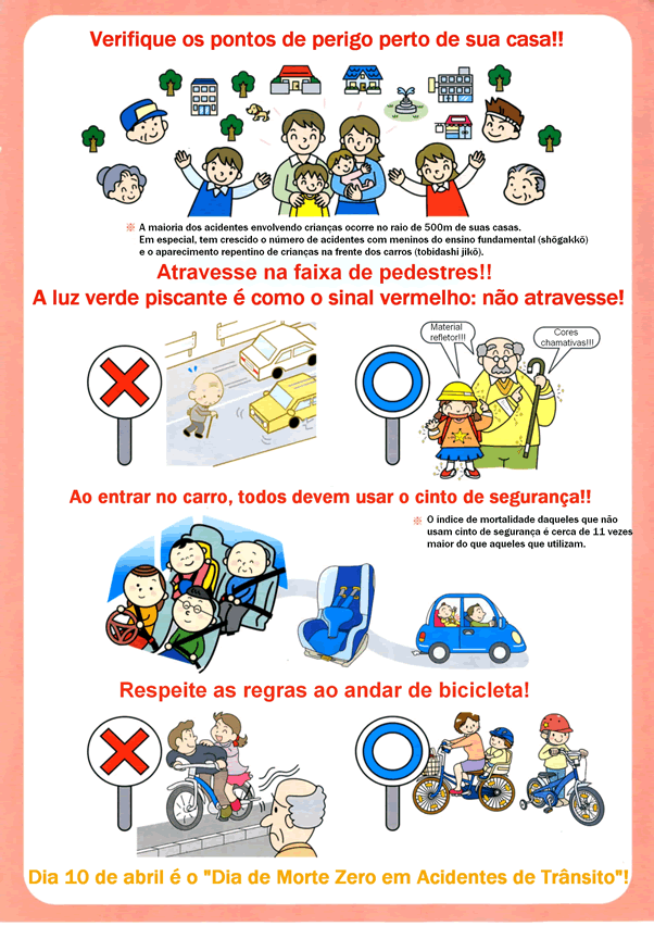 Campanha Nacional de Segurança no Trânsito durante a Primavera 春の交通安全キャンペーンについて Share! Compartilhar no Facebook(abre em nova janela) Facebook Envie um link por e-mail para um amigo(abre em nova janela) E-mail Compartilhar no X(abre em nova janela) 18+ Compartilhar no WhatsApp(abre em nova janela) WhatsApp 2010/03/24 quarta-feira Notícias, Segurança Dia 10 de abril, é o “Dia de Mortes Zero em Acidentes de Trânsito”. O Governo Japonês iniciou uma campanha nacional de segurança no trânsito. Os panfletos abaixo tem as informações e dicas importantes para os cidadãos. Respeitar as regras de segurança é muito importante. Share! Compartilhar no Facebook(abre em nova janela) Facebook Envie um link por e-mail para um amigo(abre em nova janela) E-mail Compartilhar no X(abre em nova janela) 18+ Compartilhar no WhatsApp(abre em nova janela) WhatsApp « Curso básico de japonês – Módulo 7 Lançamento do Guia de Carreiras para alunos estrangeiros (orientação profissional em diversas línguas) »