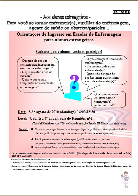 A Fundação de Intercâmbio Internacional de Mie realizará uma sessão de orientação para alunos estrangeiros sobre o ingresso em escolas de enfermagem. Serão explicadas as formas de ingresso (provas, formas de estudo, etc), informações sobre a profissão de enfermagem e outros assuntos relacionados.